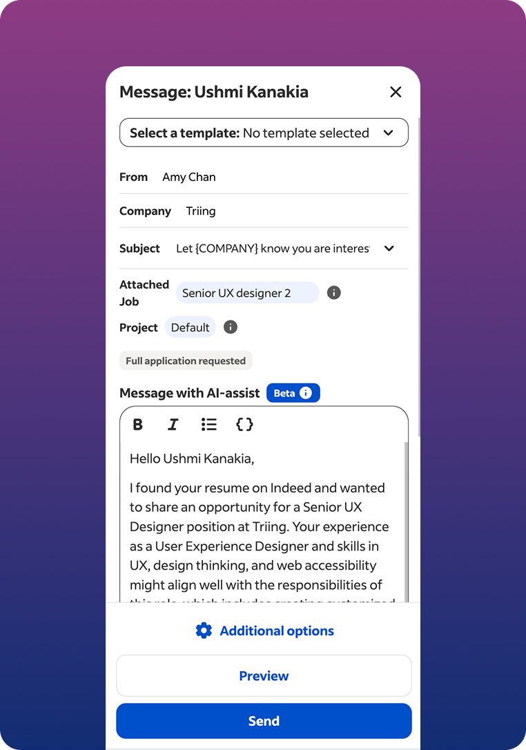 Smart Sourcing is a core part of Indeed’s hiring marketplace, contributing to a multi-million dollar revenue stream and used by thousands of employers globally. Designed employer workflows and outreach experiences to help companies identify and engage relevant candidates more efficiently.